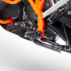 The footrest mounting position is lowered by 8 mm to improve the rider's comfort thanks to a wider knee angle, while being moved 10 mm outwards for better contact and feel when standing on the pegs.