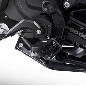 The footrest mounting position is lowered by 8 mm to improve the rider's comfort thanks to a wider knee angle, while being moved 10 mm outwards for better contact and feel when standing on the pegs.