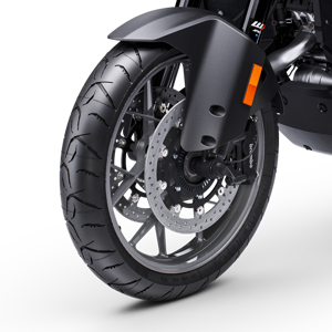 The KTM 1390 SUPER ADVENTURE S is fitted with new DUNLOP MERIDIAN tires. These tires feature an innovative 'ice-ax' tread pattern, which increases traction on unpaved roads and provides optimum water drainage. They also offer superb handling and stability on the tarmac, making them perfect for touring or tearing up mountain passes. Dimensions: 120/70 R 19 in the front and 170/60 R 17 on the rear.