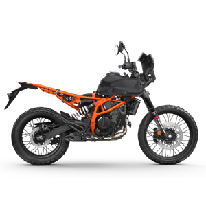 The KTM 390 ADVENTURE range features distinctive KTM-style bodywork and graphics, providing excellent ergonomics and an aggressive look inspired by KTM's vast Rally racing heritage. This can be seen in everything from the headlight mask to the front fender. The tank spoilers and rear side panels are slightly wider than the seat for optimized control when standing on the pegs, while the shape of the fuel tank is optimized to offer freedom of movement when tackling tricky technical terrain. A robust engine guard also makes its intentions known by protecting the engine and exhaust when venturing off the tarmac into the dirt.
