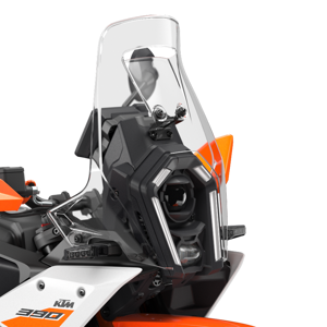 You'll no doubt hit some highways at some stage. Good thing, then, that the KTM 390 ADVENTURE range boasts a sturdy and efficient windshield. Thanks to its slim profile, the rider isn't obstructed when moving around the machine. It also offers an unobstructed view directly in front of the bike - even when covered in dirt.