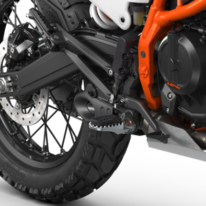 Wide, robust footpegs inspired by KTM offroad models hint at the KTM 390 ADVENTURE range party trick. With 2 adjustable positions -- standing or seated -- the footpegs are developed for all-day riding comfort. They are perfectly matched to both street and offroad boots and feature easy-to-remove rubber inserts for when the riding really gets rough.
