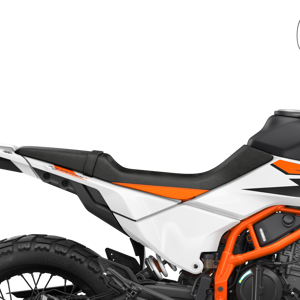 The KTM 390 ADVENTURE range features a single-piece stepped seat. The seat can be easily removed for access to the airbox and a small storage compartment underneath. The KTM PowerParts team also specifically developed different seats to match individual customer needs from comfort to riding style.