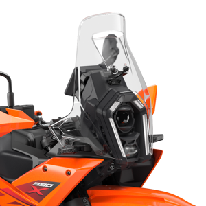 You'll no doubt hit some highways at some stage. Good thing, then, that the KTM 390 ADVENTURE range boasts a sturdy and efficient windshield. Thanks to its slim profile, the rider isn't obstructed when moving around the machine. It also offers an unobstructed view directly in front of the bike - even when covered in dirt.