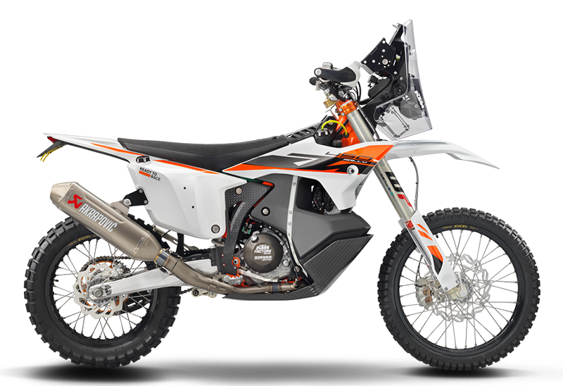 READY TO RACE bikes need racing stickers. While a simple sticker graphic kit for the all-white bodywork comes in the by-pack of the KTM 450 RALLY REPLICA, the plastics are left untouched for you to design your kit, with your team, sponsor, and individual needs.