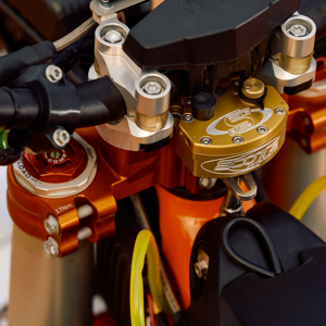 An 23 mm offset CNC machined triple clamps with a rally-specific design ensures optimal stiffness and precise handling when charging through the desert. This, together with an in-house developed PHDS system and the proven SCOTT's steering damper, provides the confidence to keep it pinned in the faster, flowing rally stages.