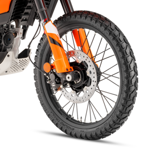 Pulling out all the stops, the KTM 390 ENDURO R is equipped with a 285 mm brake disk and Bybre caliper up front and a 240 mm brake disk and single-piston caliper at the rear. These are supported by KTM's proven ABS technology for added safety, but this can also be disabled completely for added agility offroad.