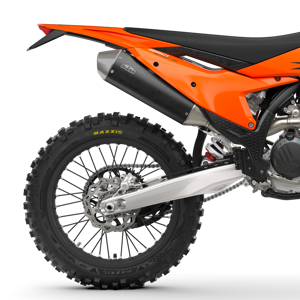 Providing the bark to the KTM 250 EXC-F bite, the exhaust system is designed to deliver hard-hitting performance at the lowest possible weight. The 2-piece header pipe design is made to be as compact as possible, with the routing of the header pipe extremely close to the engine for maximum of mass centralization and minimum exposure to rocks. At the nose-making end, a short, compact silencer is crafted from lightweight aluminum and finished in a premium matt black coating.
