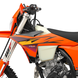 The transparent, polythene (XPE) fuel tank is a signature element of the KTM Enduro lineup. Having undergone thorough race testing in everything from the GNCC to the hardest of FIM hard enduros, these tanks are built, well, like tanks! A one-piece fuel pump and filter manage fuel supply, while servicing is made extra simple with easy fuel filter access. What's more, an updated fuel tank roll now holds the tank more firmly in place and protects the frame against scrubbing.