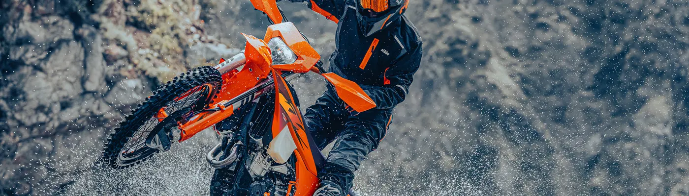 The KTM Enduro range features a rider-focussed body-position triangle, providing improved knee contact - especially when standing on the pegs - with improved gripping surfaces all around. With the plastics working to expel mud buildup in wet, muddy conditions, a flat seat profile with a high grip seat cover providing exceptional rider movement and control, and a polyamide-reinforced aluminum subframe providing unmatched rider feel and feedback, your only concern is navigating the terrain ahead of you.