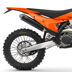 Binging the Braaap! Thanks to the KTM 250 XC-W's compact engine, the header pipe is designed with the target of achieving more ground clearance and reducing the risk of damage when riding over deep roots, ruts, or climbing steep rocks. The silencer is crafted from lightweight aluminum.