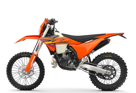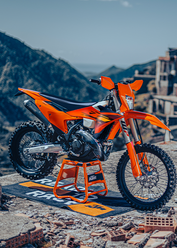 The KTM Enduro range features a rider-focussed body-position triangle, providing improved knee contact - especially when standing on the pegs - with improved gripping surfaces all around. With the plastics working to expel mud buildup in wet, muddy conditions, a flat seat profile with a high grip seat cover providing exceptional rider movement and control, and a polyamide-reinforced aluminum subframe providing unmatched rider feel and feedback, your only concern is navigating the terrain ahead of you.