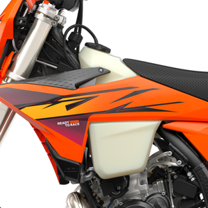 The transparent, polythene (XPE) fuel tank is a signature element of the KTM Enduro lineup. Having undergone thorough race testing in everything from the GNCC to the hardest of FIM hard enduros, these tanks are built, well, like tanks! A one-piece fuel pump and filter manage fuel supply, while servicing is made extra simple with easy fuel filter access. What's more, an updated fuel tank roll now holds the tank more firmly in place and protects the frame against scrubbing.