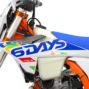 The KTM 6DAYS range sends a high-flying salute to the ISDE Italia, with striking graphics incorporating the colors of the Italian flag, a glossy orange frame, and striking blue finishes.