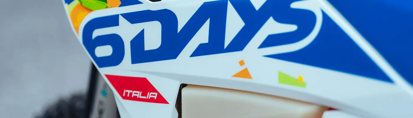 The KTM 6DAYS range sends a high-flying salute to the ISDE Italia, with striking graphics incorporating the colors of the Italian flag, a glossy orange frame, and striking blue finishes.