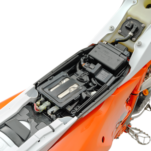 As with the rest of the 2-stroke EXC range, the KTM 300 EXC HARDENDURO is fitted with a proven, reliable electric start system. Powered by an ultra lightweight 2 Ah lithium-ion starter battery, it provides a safe, reliable starting time and time again, while the wiring harness has most of the electrical components carefully positioned under the seat for easy accessibility.