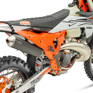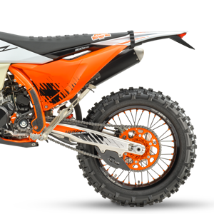 Bringing the Braaap! Thanks to the KTM 300 EXC HARDENDURO's compact engine design, the header pipe is designed with the target of achieving more ground clearance and reducing the risk of damage when riding over deep roots, ruts, or climbing steep rocks. The silencer is crafted from lightweight aluminum, saving weight and provides the signature low-down 2-stroke burble for this rock-hopping hero.