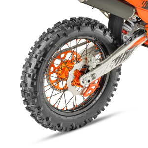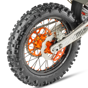 The KTM 300 EXC HARDENDURO rolls on a full-factory wheelset made up of high-strength black alloy wheels coupled to orange-anodized CNC-machined hubs, black spokes, and orange aluminum nipples. These are wrapped in a set of ultra-grippy Metzeler 6 DAYS Extreme tires providing exceptional traction in all conditions.