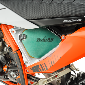 The air filter box is designed to ensure maximum airflow with minimal water intrusion. Precision in how the inlet ducts are positioned is aimed at preventing air deformation and maintaining filter protection. An enduro-specific splash protector under the airbox prevents water or dirt from splashing up from the rear wheel, while the Twin Air filter and air filter support design features a simple fail-proof mounting system for safe and accurate filter installation. All this ensures the air filter is easily accessed, without tools, for fast track-side maintenance.