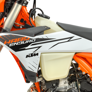 The transparent, polythene (XPE) fuel tank is a signature element of the KTM Enduro lineup. Having undergone thorough race testing in everything from the GNCC to the hardest of FIM hard enduros, these tanks are built, well, like tanks! A one-piece fuel pump and filter manage fuel supply, while servicing is made extra simple with easy fuel filter access. What's more, an updated fuel tank roll now holds the tank more firmly in place and protects the frame against scrubbing.