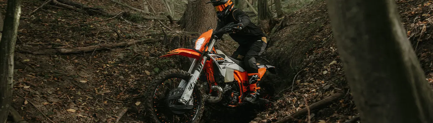 The KTM EXC range features a rider-focussed body-position triangle, providing improved knee contact - especially when standing on the pegs - with improved gripping surfaces all around. With the plastics working to expel mud buildup in wet, muddy conditions, a flat seat profile with a high grip seat cover providing exceptional rider movement and control, and a polyamide-reinforced aluminum subframe providing unmatched rider feel and feedback, your only concern is navigating the terrain ahead of you.