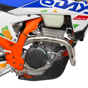 Providing the bark to the KTM EXC-F 6DAYS ranges bite, the exhaust system is designed to deliver hard-hitting performance at the lowest possible weight. The 2-piece header pipe design is made to be as compact as possible, with the routing of the header pipe extremely close to the engine for maximum of mass centralization and minimum exposure to rocks. At the noise-making end, a short, compact silencer is crafted from lightweight aluminum and finished in a unique 6DAYS anthracite color, proudly displaying the 6DAYS logo.