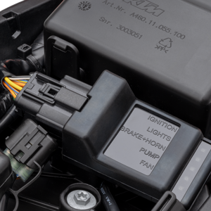 The Offroad Control Unit - or OCU - is located under the seat and replaces all the electronic fuses and relays. All outputs are switched depending on signals from the voltage regulator and the ECU continuously. In the event of over-current, outputs are deactivated individually. This makes for easy error detection as the status of each output is indicated by a red or green LED light. This means diagnosing an electrical issue out on the trail is as easy as lifting the seat, and there's no more need to carry fiddly fuses.