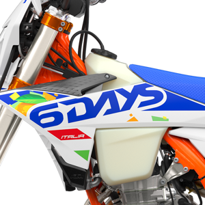 The KTM 6DAYS range sends a high-flying salute to the ISDE Italia, with striking graphics incorporating the colors of the Italian flag, a glossy orange frame, and striking blue finishes.