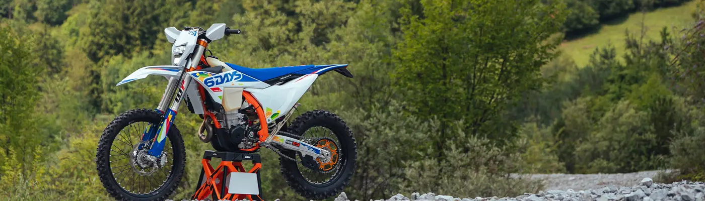 The first KTM bearing the 6DAYS name tore onto the scene way back in 1996. Almost 30 years later, we're still keeping that legacy alive. All KTM 6DAYS models receive the full 6DAYS treatment, from machined orange anodized triple clamps, right down to a solid rear brake disc. Each and every element on a 6DAYS model is specifically chosen for the job at hand, stamped with a coveted 6DAYS logo, and let loose to dominate the field.