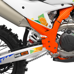 Specifically engineered for longitudinal rigidity, the KTM EXC-F range is engineered around a gloss-orange powder-coated frame providing exceptional rider feedback, energy absorption, and high-speed stability. This is achieved by repositioning the rotating masses in the frame along with a forged steering head connection. The footrest mounts also feature a slim design for less risk of hooking up. And when the ride comes to an end, a forged one-piece side stand ensures your enduro weapon stands proud.