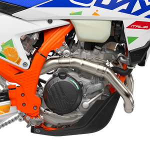 Providing the bark to the KTM EXC-F 6DAYS ranges bite, the exhaust system is designed to deliver hard-hitting performance at the lowest possible weight. The 2-piece header pipe design is made to be as compact as possible, with the routing of the header pipe extremely close to the engine for maximum of mass centralization and minimum exposure to rocks. At the noise-making end, a short, compact silencer is crafted from lightweight aluminum and finished in a unique 6DAYS anthracite color, proudly displaying the 6DAYS logo.