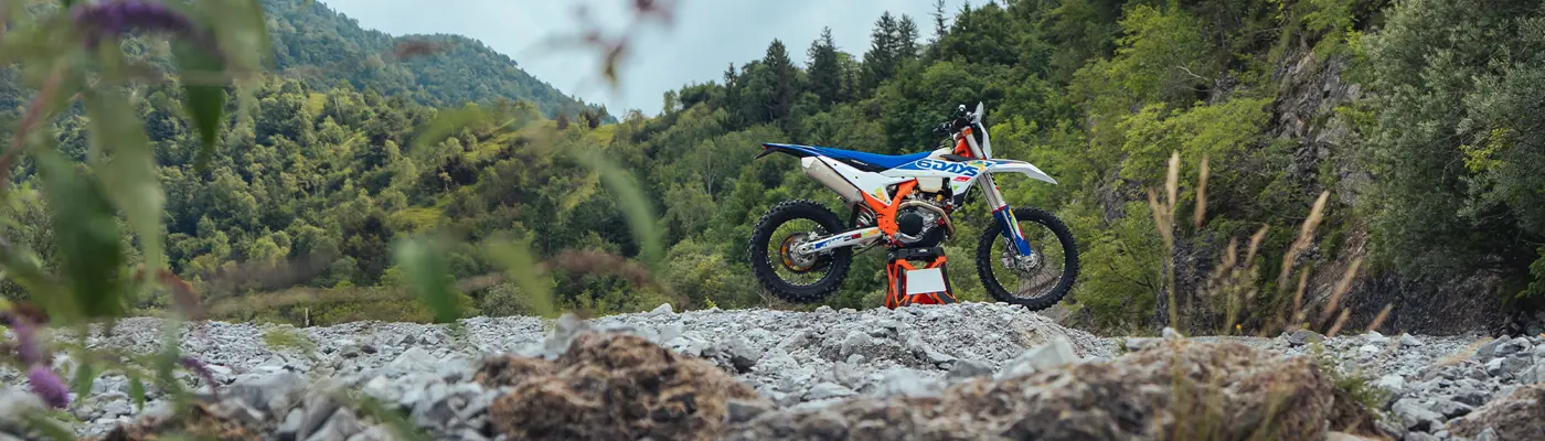 The first KTM bearing the 6DAYS name tore onto the scene way back in 1996. Almost 30 years later, we're still keeping that legacy alive. All KTM 6DAYS models receive the full 6DAYS treatment, from machined orange anodized triple clamps, right down to a solid rear brake disc. Each and every element on a 6DAYS model is specifically chosen for the job at hand, stamped with a coveted 6DAYS logo, and let loose to dominate the field.