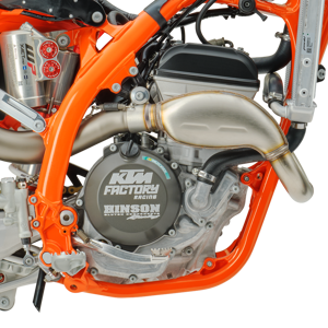 The 2026 KTM 250 SX-F FACTORY EDITION engine is tilted 2° backward, this means greatly improved mass centralization and reduced overall weight, benefiting handling and anti-squat behavior. A silencer offers an improved response in combination with the mapping switch and provides a slightly quieter exhaust note.