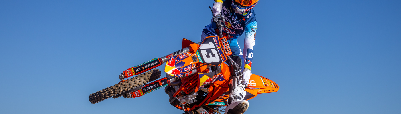 Getting power hooked into the dirt is a tough job. However, hours of research and testing have led the 2026 KTM Motocross range to the Dunlop GEOMAX MX34. Providing unmatched stability and control at the highest level, the rubber features a rigid carcass and rubber compound that improves damping and absorption, maintaining performance up to 30% longer than previous models. Progressive Cornering Block Technology also improves grip in the berms, while the rear pattern has a tall and wide center block for desirable traction and control everywhere else. Lastly, this unique block arrangement works to dispel mud buildup, ensuring traction in even the muddiest of track conditions.