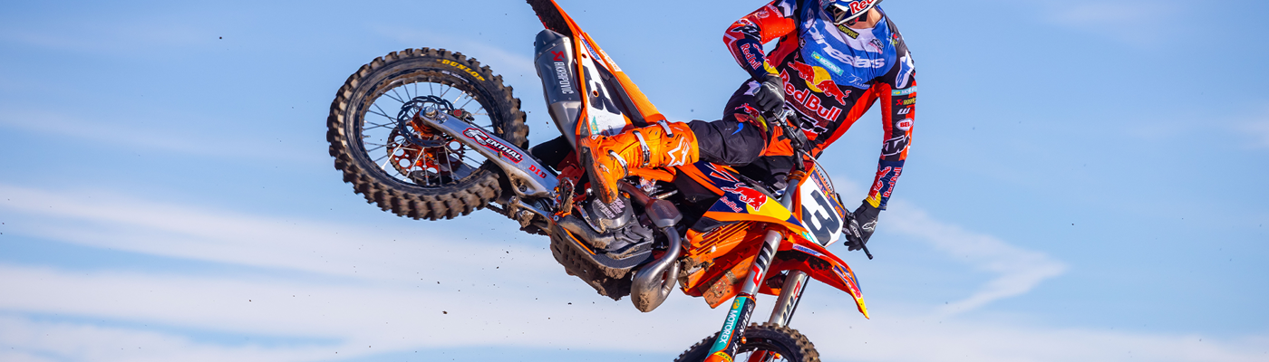 Getting power hooked into the dirt is a tough job. However, hours of research and testing have led the 2026 KTM Motocross range to the Dunlop GEOMAX MX34. Providing unmatched stability and control at the highest level, the rubber features a rigid carcass and rubber compound that improves damping and absorption, maintaining performance up to 30% longer than previous models. Progressive Cornering Block Technology also improves grip in the berms, while the rear pattern has a tall and wide center block for desirable traction and control everywhere else. Lastly, this unique block arrangement works to dispel mud buildup, ensuring traction in even the muddiest of track conditions.