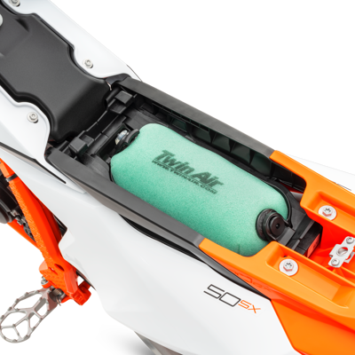 The airbox features a conventional suction sleeve made from a hard-wearing polyamide instead of rubber and a Twin Air filter mounting system that features snap locks for easy and intuitive mounting. The Twin Air filter is also placed under the seat and is easily accessible without any tools by simply removing the seat. It also features improved dirt intrusion resistance, with no more dirt falling into the intake tract when changing the filter.