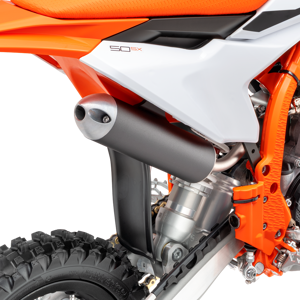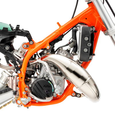 The exhaust system benefits from the same manufacturing process as the full-size 2-stroke KTM SX range, with improved overall quality and performance. This has resulted in massive progressions in thermodynamics. Moreover, tighter sealing of the silencer end cap and a rubber between the header pipe and silencer adds another level of quality to the exhaust system. The silencer comes with a black anodized finish and a signature 'Braaaaap!'. Modifications include a flange gasket for better durability and the exhaust valve ventilation has been redesigned. It is more 'bulletproof' thanks to extra efficient and locally sourced manufacturing at KTM HQ.