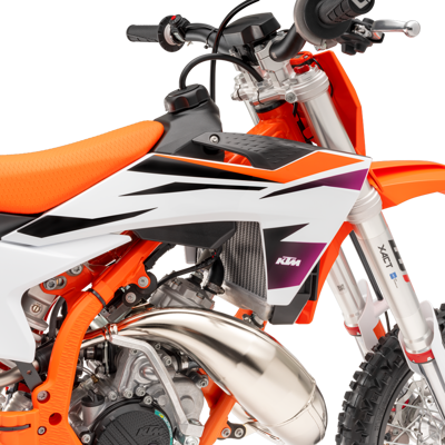The KTM 50 SX has state-of-the-art Pankl radiators inspired by the full-size KTM SX range and features the same basic design with all the hardcore cooling properties. The KTM 50 SX uses one large radiator with more capacity instead of two smaller separate ones. This concept allows for better integration of the radiator into the frame and the tank spoilers to channel air through the cooling fins efficiently.