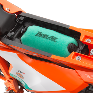 The airbox features a conventional suction sleeve made from a hard-wearing polyamide instead of rubber and a Twin Air filter mounting system that features snap locks for easy and intuitive mounting. The Twin Air filter is also placed under the seat and is easily accessible without any tools by simply removing the seat. It also features improved dirt intrusion resistance, with no more dirt falling into the intake tract when changing the filter.