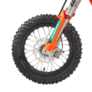 Featuring the same level of technology offered on the full-size KTM SX range, the KTM 50 SX FACTORY EDITION is fitted with hydraulic brake calipers and waved, state-of-the-art front and rear brake discs. This system ensures advanced braking feel and unmatched stopping performance in all conditions, specifically on wet or muddy tracks, with improved durability and brake pad longevity.