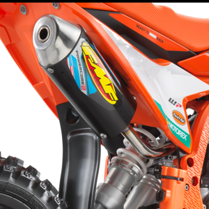 A complete FMF exhaust system consists of the nickel-plated FMF fatty pipe and the FMF Powercore 2 silencer, with a signature 'Braaaaap!'. A black anodized, CNC-machined exhaust flange takes care of the perfect integration of the FMF exhaust system. Modifications include a new flange gasket for better durability and the exhaust valve ventilation has been redesigned. It is more 'bulletproof' thanks to extra efficient and locally sourced manufacturing at KTM HQ.