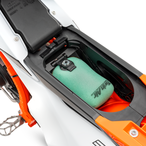 The airbox features a conventional suction sleeve made from a hard-wearing polyamide instead of rubber and a Twin Air filter mounting system that features snap locks for easy and intuitive mounting. The Twin Air filter is also placed under the seat and is easily accessible without any tools by simply removing the seat. It also features improved dirt intrusion resistance, with no more dirt falling into the intake tract when changing the filter.