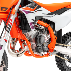 The KTM 65 SX boasts a high-strength chromium molybdenum steel frame design with forged connecting parts integrated into the frame. This together with carefully calculated parameters of longitudinal flex and torsional rigidity, allow tailormade stiffness and an unprecedented quality of the Mini frame could be achieved. The frame layout features a typical MX design without any cross tube behind the steering head. Like our full-size models, the rear shock mount is separated from the main upper frame tube. The frame also comes with frame protectors as standard.