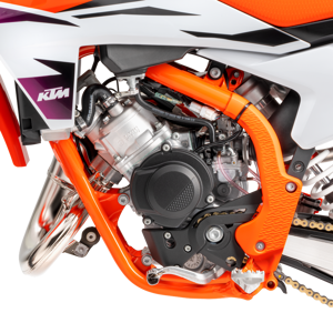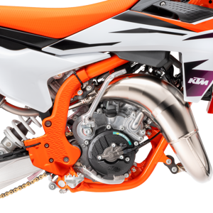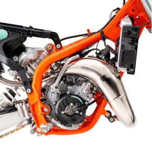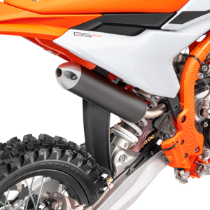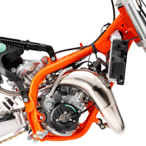 The exhaust system features the same manufacturing process as the full-size 2-stroke KTM SX range, with high overall quality and performance. This has resulted in massive progressions in thermodynamics. Moreover, improved sealing of the silencer end cap and a rubber between the header pipe and silencer add another level of quality to the exhaust system. The silencer comes with a black anodized finish and a signature 'Braaaaap!'. The modifications include a new flange gasket for better durability and the exhaust valve ventilation has been redesigned. It is more 'bulletproof' thanks to more efficient and locally sourced manufacturing at KTM HQ.