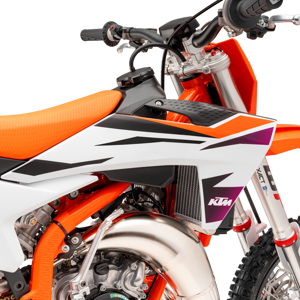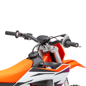 The bodywork of the KTM 65 SX is the perfect example of KTM's commitment to providing the ultimate starting point for young racers. Mimicking the full-size KTM SX range, the KTM 65 SX features the same advancements found in the larger KTM SX classes. Slimmer, sleeker, and better suited to standing on the pegs, the side panels now work much better with young riders' boots, allowing proper squeezing of the bike when standing up. The front number plate incorporates plastic flaps to protect the lower triple clamps from roost. Speaking of triple clamps, the KTM 65 SX now has an improved fixing mechanism which hikes the lifespan of the steering head bearings thanks to the extra block from dirt and water. The wrench size is also smaller and more practical.