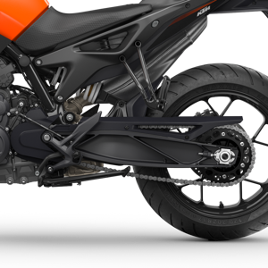 At 825 mm, both shorter and taller riders can enjoy the bike at full tilt, without losing sight of the daily usability. The new seat cover is grippy but still allows the rider to move around the bike easily. It has been developed to work with textile and leather, in keeping with the wide range of riders and riding styles. 805 mm is possible with the lower KTM PowerParts seat.
