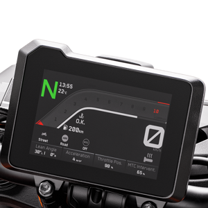 An all-new 5" bonded glass TFT dashboard is upgraded with the latest graphic and information software, making it faster, easier to navigate and designed to give riders faster access to the various features of the bike with far fewer clicks. The TFT also works in conjunction with the optional