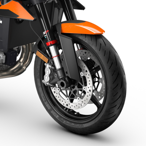 Configurable with up to 5 different ride modes, the KTM 990 DUKE is ready to dominate just about any eventuality. In the default STREET setting, riders have full power, traction control, and limited front wheel lift, with easy throttle response. SPORT steps the experience up with sharper throttle control and some wheel slip, while RAIN mode does what it says on the box, providing maximum traction and reduced power in wet conditions. The optional PERFORMANCE and TRACK modes crank the KTM 990 DUKE all the way to 11, providing enhanced rider customization and focused sport riding.