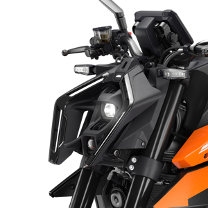 An all-new, lightweight LED headlight design adds to the KTM 990 DUKE's menacing look while turning night to day. With daytime running lights that automatically adjust in intensity according to the ambient light conditions, and automatic low beam that stays illuminated for a moment after the ride is done, not only do the LEDs on KTM 990 DUKE burn a hole into the darkness - it is smart too.
