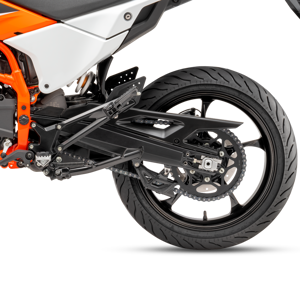 A gravity die-cast swingarm has been specifically developed for the KTM 125 SMC R, and provides a sturdy and durable platform for the rear suspension system. Featuring a direct shock absorber mount offset to the side, it creates additional space for the unique exhaust system.